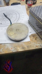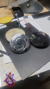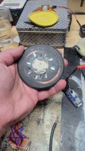 The Receiver Pad is a hockey puck shaped device that interacts with the talismans or magical objects that are to be transmitted. It features a special type of “induction” coil made of copper tubing filled with a special compound that is excited by a fine electrically conductive thread. At one end of the coil is a “button” filled with a compound that is designed to to be hyper-sensitive to energetic/informational signals. At the other end of the coil is an energy absorbing design based on some of Wilhelm Reich’s theories.